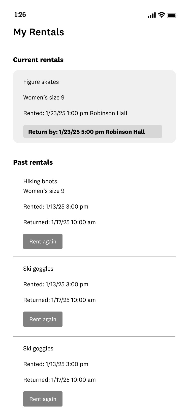 Rentals are currently tracked using paper and writing down names and dates. Student IDs have to be presented on the spot. Inventory is large and hard to track live, especially sizes, and the website only lists what exists, not quantities.